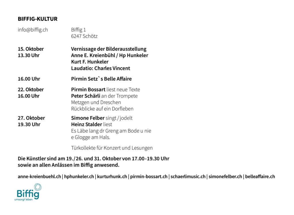 An drei verschiedenen Daten im Oktober wird Kultur bei uns auf unterschiedliche Art erlebbar. Künstler aus der Region zeigen ihre Bilder, lesen ihre Texte, spielen ihre Musik, singen und jodeln.