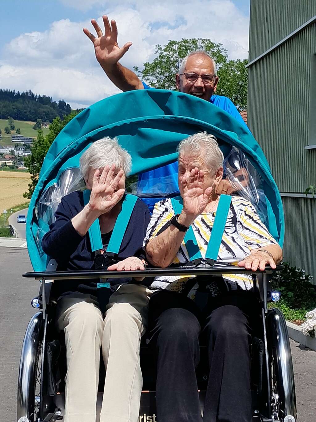 An mehreren Nachmittagen durften unsere Kunden eine erste Probefahrt mit unserem "Velo-Taxi" der neuen Rikscha machen. Chauffiert wurden sie durch die freiwilligen Rikscha -Piloten, die sich bei den Freunden Biffig für das Durchführen von Ausfahrten gemeldet hatten. Für die Wartenden gab es ein Getränk im Schatten, damit sie später den Fahrtwind um die Nase geniessen konnten - so lassen sich die heissen Sommertage angenehm verbringen. An den strahlenden Gesichtern war der Spass eindeutig erkennbar. Eine individuelle Rikscha-Fahrt für unsere Kunden kann ab sofort gebucht werden. Unsere Kunden melden sich dazu bitte bei den Mitarbeitenden der Aktivierung.