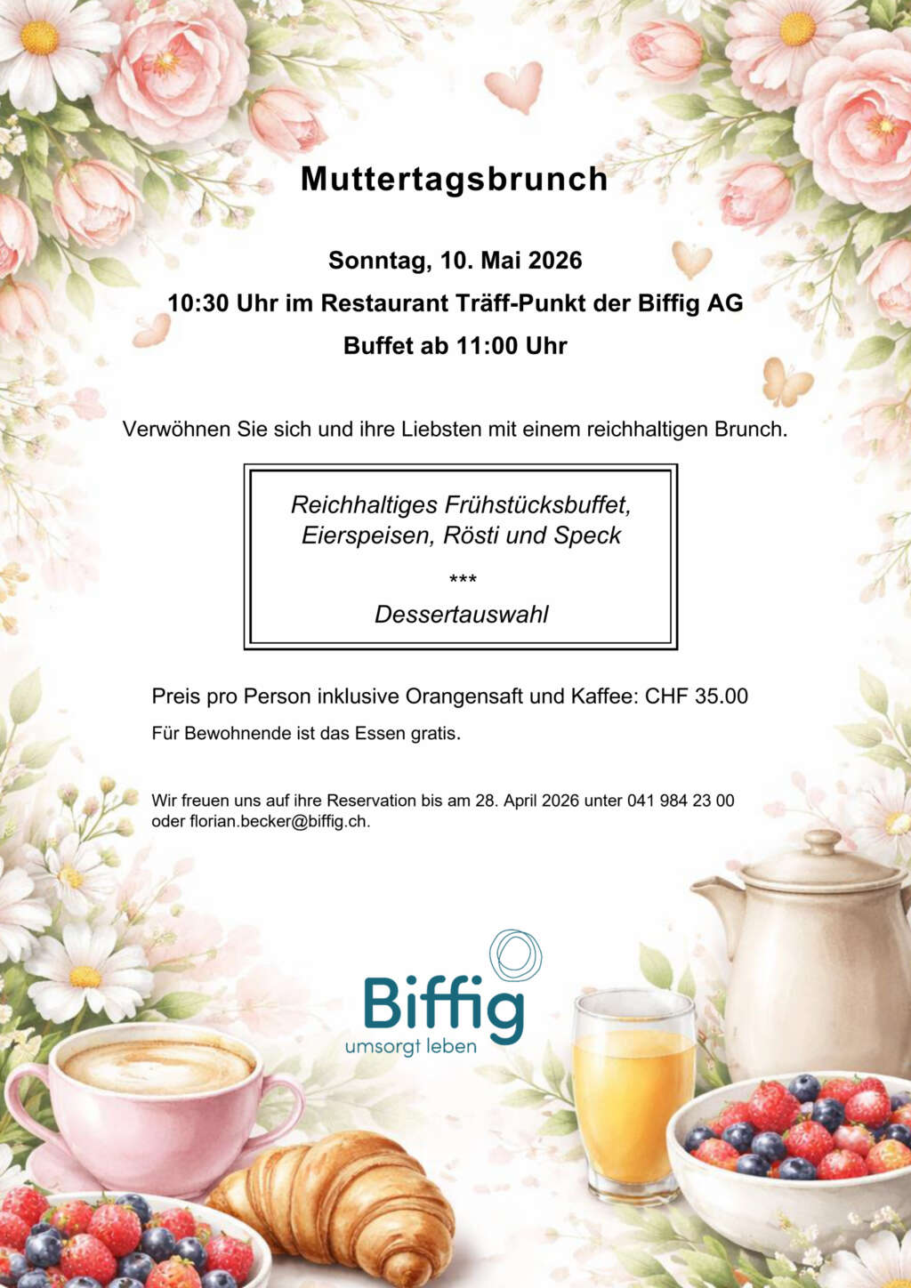 Preis pro Person inklusive Orangensaft und Kaffee: CHF 35.00